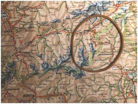 However, when returning to England he seems to have changed his mind, instead choosing the route from Milan to the north over Mount Sampion leading into adjacent Swiss territory. From afar, he admires the prospect of the snow-covered Alps and of the “obscure villages”, though he blames the “wretched lodgings” he found there. The area is, in his own words, full of “strange, horrid, and fearful crags and tracts … inhabited by bears, wild goats, and wolves, who have sometimes assaulted travelers”, and the local population speaks “that barbarous language, being a mixture of corrupt High German, French, and Italian.” His company crosses highly dangerous narrow bridges, made of hewn trees loosely placed athwart from the one craggy mountain side to the other.